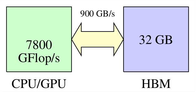 As it has already been mentioned earlier, the Nvidia Tesla-100 (at the moment the top HPC accelerator) has the peak computing power 7800 GFlop/s (double precision), and the memory bandwidth 900 GB/s (when working with the HBM which has the capacity 16 or 32 GB).