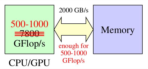If, e.g., the memory bandwidth is increased to 2000 GB/s, we can expect that the actual performance of a single processor could optimally be from 500 GFlop/s (the extreme case of the HPCG benchmark) up to about 1000 GFlop/s for general simulations.