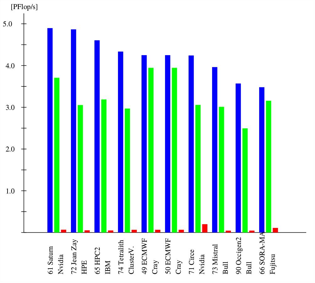 In order to show that a very bad HPCG performance is not limited to the top supercomputers, the present page shows data for top 10 supercomputers of the June 2019 Top500 list (ordered by the peak performance) such that