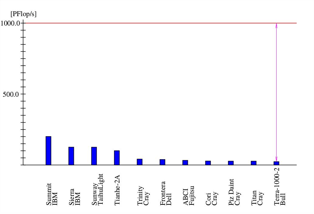 This page is a plot of the computing power of the top 10 supercomputers plus Terra-1000-2, the most powerful computer ever built in Europe (Atos/Bull) (source Top500, June 2019).