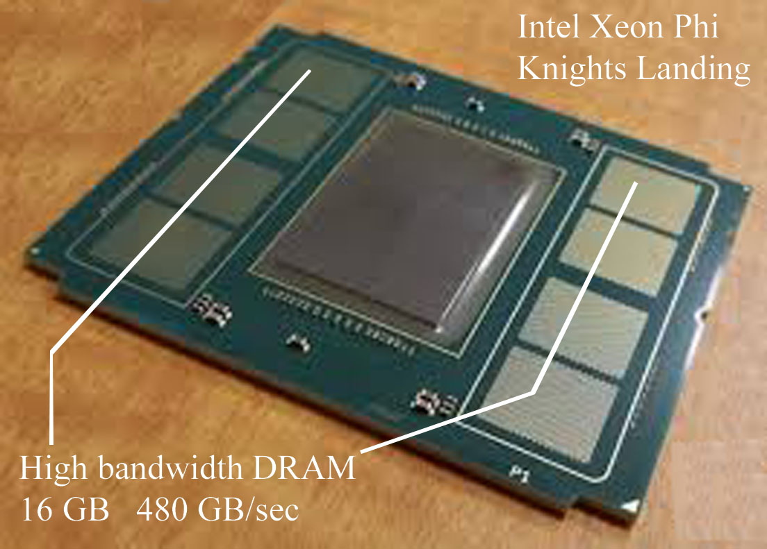 Intel Xeon Phi "Knights Landing" has also high bandwidth DRAMs (denoted as MCDRAM). Their capacity is 8x2 = 16 GB, and the memory bandwidth about 480 GB/s.