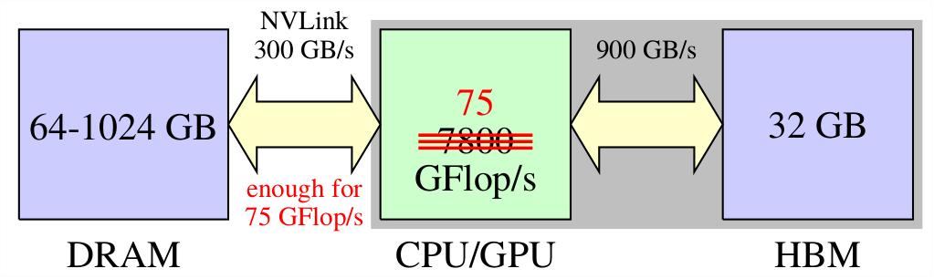 However, if the HPCG computation of Nvidia Tesla-100 uses the external data source, connected via NVLink, the upper bound to the performance drops to about 75 GFlop/s.